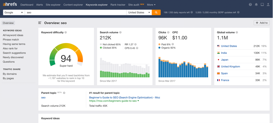 Ahrefs es hoy en día la herramienta clave de todo administrador web para lograr que su sitio alcance la cima en los resultados de los buscadores. Está enfocada al linkbuilding, y la lista de herramientas que trae para llevar control de backlinks es impresionante.